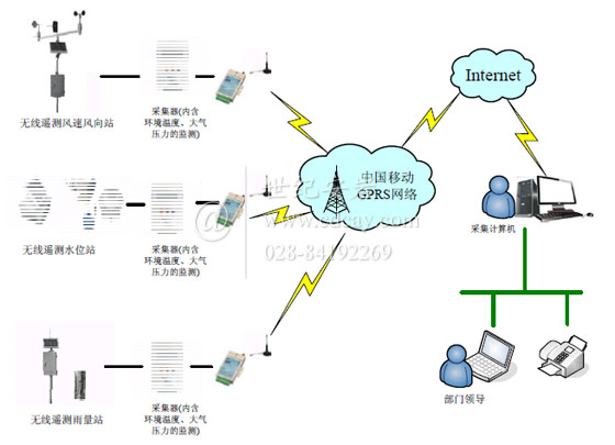 水雨情自動測報系統(tǒng)由無線遙測水位站、無線遙測雨量站、無線遙測風(fēng)速風(fēng)向站、無線傳輸模塊以及數(shù)據(jù)通訊、采集、管理軟件所組成。其中無線遙測雨量站除了具有監(jiān)測降雨量還新增加了環(huán)境的監(jiān)測(環(huán)境溫度、大氣壓力、空氣濕度)。整體結(jié)構(gòu)如下圖(圖一)所示,圖中通訊方式已GPRS/CDMA 無線傳輸為例,具體情況依實際需求而定。該系統(tǒng)集水雨情數(shù)據(jù)自動采集、數(shù)據(jù)通訊、數(shù)據(jù)處理、水雨情編報、信息管理、系統(tǒng)運行管理為一體的行業(yè)信息化業(yè)務(wù)應(yīng)用系統(tǒng)。為實施水文水情雨情信息自動化建設(shè)提供科學(xué)、經(jīng)濟實用的解決方案。